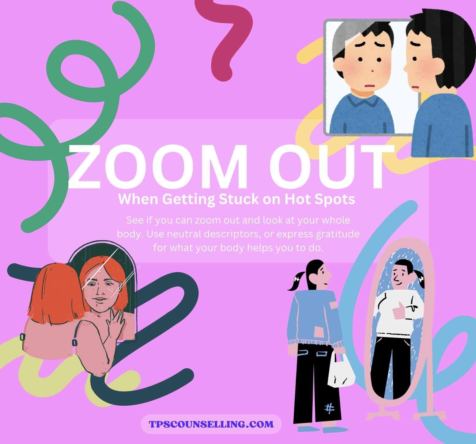 Why It Helps: Zooming out from the areas of distress allows you to see your body in a more balanced and less critical way. By neutralizing your language and practicing gratitude, you can begin to break free from the cycle of negative body image and appreciate the amazing things your body does for you every day.